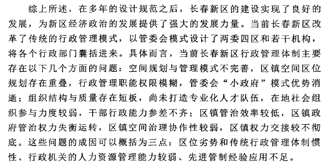 善行政管理服务模式。长春新区要紧紧的抓住国家战略提供的发展机遇,在深化改革的过程中推动行政管理体制的不断创新,适应经济社会的发展需要。从行政管理发展的角度来看,长春新区在国家政策的支持下,已经实现了良好的发展与创新,但是在发展的过程中,随着发展需求与时代的变化,总归会存在各种各样的问题。对于国家新区而言行政管理体制变革同样意义重大,当前长春新区在4年的发展之后朝着新的方向发展,其行政管理体制中存在的弊端对于经济政治的发展存在一定的阻碍,因而以更科学的手段推动其体制变革,调整各利益主体关系,保障效率的提升,是长春新区急需重视的问题。因此一定要根据实际情况的变化来开展创新。长春新区在发展的过程中,究竞是走向行政区模式,还是根据自身实际改革创新构建新的行政发展模式,都需要注重一个重要的问题,那就是要切实保障实质效果,而非形式上的管理体制改革。