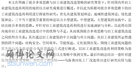 文章首先,对统合多效思维的形成与发展进行梳理,以中国古典哲学思想出发对统合多效思维进行阐释,并通过旧工业建筑改造现状问题归纳总结出统合多效思维与旧工业建筑改造之间的契合点。其次,通过统合多效思维在建筑学理论与实践中的运用为统合多效思维在旧工业建筑改造中的运用提供支撑。通过旧工业建筑改造设计必然所遇到的结构加固、空间效率、节能保温以及文化氛围四个问题进行排列组合,从而对统合多效的思维方式加以详细说明。最后,论文以实践的层面对旧工业建筑改造中统合多效思维进行运用,形成以统合多效思维方式为主导的旧工业建筑改造设计。