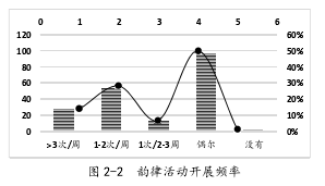图 2-2 显示,50%的教师偶尔开展韵律活动,即幼儿园中有观摩课、省市级优质课评选时,教师会精心设计教学活动环节,充实教学活动内容。28%的教师每周开展 1—2 次的韵律活动,2—3 周开展一次韵律活动的教师占 7%,没有开展过韵律活动的教师比例很小,占总调查人数的 1%,能够在一周进行 3 次以上的教师占总数的 14%。由此可见,一半的教师开展韵律活动的时间都没有固定的频率。