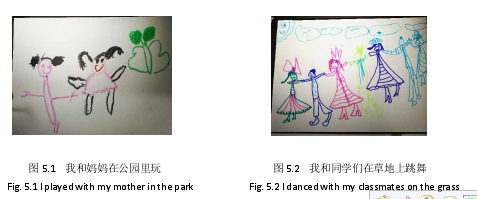从本研究的数据中可以看出,4~6 岁儿童人物情景画中,内容与主题的一致性随着年龄增长,变化十分显著。4 周岁的儿童对绘画主题的表达十分有限,只有约 20%的儿童能够表现出“我和 xxx 在一起做 xx”这个主题,大部分儿童所表现出来的只是一个个绘画 形象的简单排列,只能表达 出题目中的“我”和“谁”,有部分儿童能够描绘出场景,比如蓝天、白云、小草、月亮等等,但大部分儿童无法表现出正在做的事情。如在访谈中儿童说自己的作品题目叫做《 我 和 同 学 在 一 起 玩 玩 具 》 , 但 作 品 中 只 有 “ 我 ” 和 “ 同 学 ” , 没 有 “ 玩具”。5 周岁儿童中有约 40%能够描绘出题目中的全部人物形象和情景,到了 6周岁,能够完全表现出题目的儿童达到了 50%。从访谈中可以了解到,随着儿童年龄的增长,儿童会逐渐意识到自己的绘画内容与题目之间一一对应的关系,6周岁的儿童甚至可以抓住绘画题目所涉及到的活动中最重要的内容并用不同方式表现到作品中,如对于和同伴一起玩玩具这个场景来说,儿童可以在每人手上画一个玩具来表示在玩玩具,也可以在人物形象之间画出一个玩具来表示;同时,有少数儿童能够表现出与题目无关,但可以表现出情景的形象,如画出吊灯表示在室内,画出锅和碗以及刀叉表示在厨房等等(参见图 5.1,图 5.2)。
