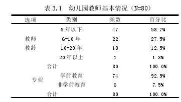 由表 3.1 可知,在所调查的 80 位幼儿教师中,5 年以下教龄的教师占 58.7%,6-10 年教龄的教师占 27.8%,92.5%的幼儿教师是学前教育出身,这从侧面反映了该地区中青年教师的比例较高,教师队伍专业化程度较高,为学前教育事业奠定了发展的基础,但多数教师教龄较短,在一定程度上会影响他们的实际经验。