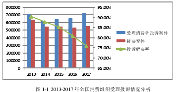 保护消费者权益一直是我国政府比较重视的一项工作。为此,工商部门成立了专门的12315 消费者维权平台,以“一会两站”为依托,大力开展消费维权行动,维护广大消费者的合法权益,并取得了显著的成效。近五年,我国消费维权工作一直维持在较高水平。如图一所示,从 2013 年至 2017 年,全国消协组织受理消费者投诉案件大致呈上升趋势,且投诉解决率均维持在 75%以上,每年都为消费者挽回巨额经济损失。以 2017 年为例,全年全国消协组织共受理消费者投诉 726,840 件,解决 552,398 件,投诉解决率 76%,为消费者挽回经济损失 51,639 万元。