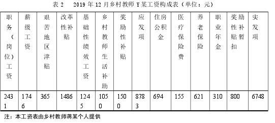 表 2 2019 年 12 月乡村教师 Y 某工资构成表(单位:元)