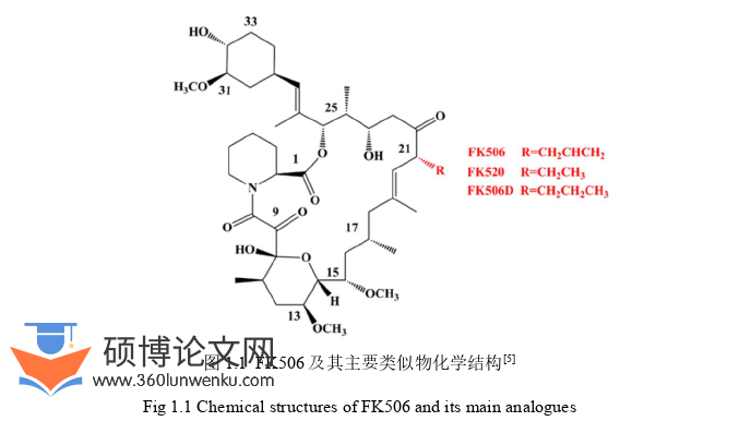 FK506是一种大环内酯类抗生素,又名他克莫司,分子式为C44H69NO12,其化学结构为两个酮,一个二十三元大环内酯(或酯),一个酰胺,一个乙烯基,两个三取代烯烃,一个半甲酮,三个O-甲基,和五个C-甲基,其余是12个亚甲基和13个甲基[4]。FK506主要的副产物包括FK520、FK506D,它们的主要区别在于FK506的C-21烯丙基侧链被FK520中的乙基和FK506D中的丙基取代(图1.1)。