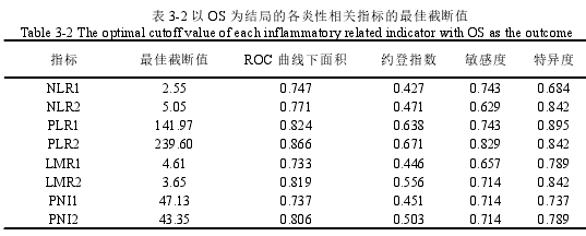 表 3-2 以 OS 为结局的各炎性相关指标的最佳截断值