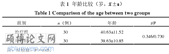①年龄分布:治疗组平均年龄:(40.63±11.52)岁,对照组平均年龄:(39.63±10.85)岁。