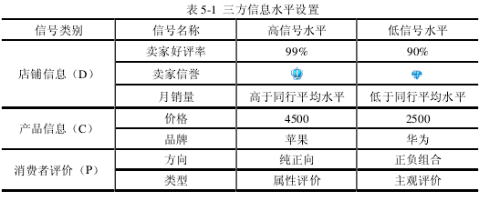 根据研究一的数据结果,以三方信号组合中对消费者决策贡献率最大的前两三个信号代表三方信息,构建模拟网站。采用 2(高店铺信息水平 vs.低店铺信息水平)×2(高产品信息水平 vs.低产品信息水平)×2(高评价信息水平 vs.低评价信息水平)被试者间因子实验设计,以高卖家好评率、卖家信誉和月销量反映高水平的店铺信息,以低卖家好评率、卖家信誉和月销量反映低水平的店铺信息;以较好品牌和高价位代表高水平的产品信息,以较差品牌和低价位代表低水平的产品信息;以纯正向的属性评价代表高水平的消费者评价信息,以正负组合的主观评价代表低水平的消费者评价信息,来研究三方信息对消费者选择意向的影响,具体信息水平的设置如表 5-1 所示: