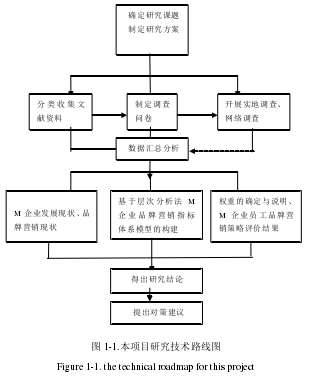 本文共分为六部分,第一部分为绪论,主要介绍了品牌营销的相关的研究的背景、内容、综述、创新点等;第二章主要对相关概念及理论基础进行介绍,并对发达国家的品牌营销策略进行借鉴;第三章主要是 M 企业品牌营销现状及问题分析,包括 M 企业简介、 M 企业品牌发展历程及企业荣誉、M 企业的所处的经营环境分析、调查对象基本数据汇总、M 企业品牌营销策略存在的问题;第四章主要是基于层次分析法对评价指 标体系进行构建,主要涉及到 M 企业品牌营销评价指标体系构建的思路和原则、M 企业品牌营销评价指标体系测评指标权重的确定、M 企业实地调查概况、M 企业员工品牌营销策略评价结果等内容;第五章为完善 M 企业品牌营销策略的建议,主要包括拓展渠道策略、推广产品策略、丰富促销策略、深化服务策略、注重品牌营销人力资本投资等;第六章为结论。本项目研究技术路线图如 1-1 所示: