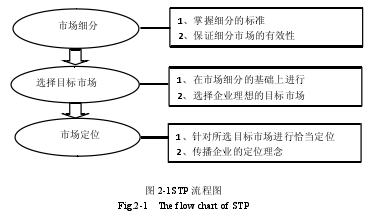 从市场营销角度出发,面对现实和潜在消费者的不同需求,企业如何利用有限的资源最大程度上满足消费者,是任何一个企业都必须要考虑的问题。因此面对消费者的多种需求,企业只能结合自身的优势选择最有效的消费者并为之提供优质的产品和服务。美国市场营销学家 Wendell Smith 最早在 1956 年提出市场细分的概念,认为“由于消费者需求的不同,企业将产品和服务即将进入的市场按照一定的标准进行细分”。之后,Philip Kotler又对市场细分的概念进行完善和改进,最后成就了被学术界认可的 STP 理论。(如图 2.1所示)。