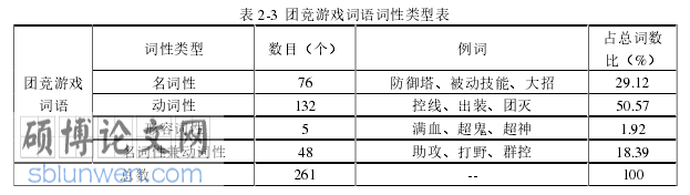 第一,对团竞游戏词语进行界定并从词汇学角度进行分析。团竞游戏词语具有网络语言和行业语的双重性质,是玩家在游戏平台上进行游戏活动时,或者游戏平台下进行关于游戏活动的讨论时使用的游戏词语,包括游戏机制设定的词语和玩家用于描述游戏事物和活动而创造或借用的词语。本文选定 261 个团竞游戏词语,从语义类型上分为团竞游戏事物类和团竞游戏行为类两种;从来源上已有词语和游戏创造词语两类;从结构特征角度将纯汉字词语和含有其他字符的词语分开考察,纯汉字词语包括单纯式、复合式、附加式三种类型,含有其他字符的词语包含“汉字+字母”“汉字+英语词”“汉字+数字”“纯字母”“英语词”五种类型;从词性特征的角度分为名词性、动词性、形容词性和兼类词四类;从造词特征角度看有借用外来语、意译词、多种符号组合造词、比拟造词、缩略造词、谐音造词六种造词方式。