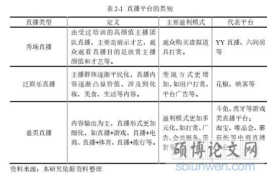 互联网技术的不断发展,特别是智能手机的普及和移动网络的大面积覆盖,使直播行业得以发展迅速。从 2005 年开始,网络直播正式进入探索阶段,如六间房、YY 等基于 PC 端的秀场直播就吸引了大批用户。2012 年,秀场直播用户规模基本稳定,游戏直播初成规模,直播进入了启动阶段,开始呈现多样化发展态势。2016 年,网络直播在中国呈现爆发式发展,被称为中国网络直播的元年。移动端直播的普及,加速了直播进入全民应用时代。随着中国网络直播平台在数量和类型上的不断丰富和增加,目前直播平台大概可以分为秀场类直播、泛娱乐类直播、垂直领域平台三大类[10],其中电商+直播是目前新兴的一种垂直类直播模式,被业界认为是下一个电商风口。