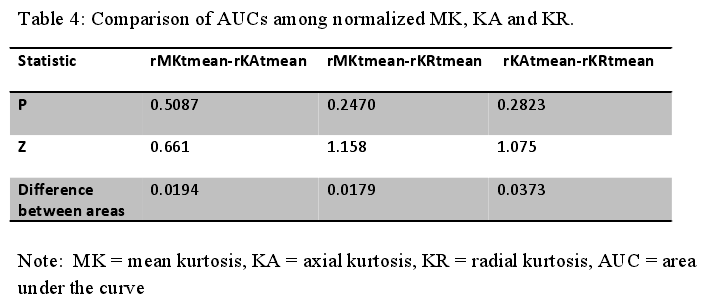 Pre-operative distinction of benign and non-benign meningioma is a critical stepfor it decides the therapeutical schedule and the surgical approach (to determinethe extent of tumor resection) for the different group differently. In cases withincidental findings, the dilemma as to treat or not to treat would be resolved to agreater extent with preoperative differentiation. Non-benign (Grade II/III)meningiomas display significant higher mean time for doubling of the tumorvolume than benign meningiomas [44]. Moreover non-invasive assessment ofmeningioma grade helps to permit dose escalation in Grade II/III meningiomas [45](non-benign) in which tumor control rate with Gama-knife surgery is 76% and56% respectively [46].In this study, we used DKI, an advanced non-Gaussian imaging technique forefficient differentiation of benign and non-benign meningiomas, comparativeanalysis of the kurtosis and conventional diffusion metrics between the benign andnon-benign meningiomas were done, and the subsequent efficiency wasdetermined by the ROC curve. The normalized value of MK, KA and KR allshowed significant result in differentiating benign and non-benign meningioma,they were shown to be effective in differentiating benign from non-benignmeningiomas, also AUC of ROC curve was greater for normalized KA than MK orKR and optimally promising than the other conventional diffusion metrics. Basedon the AUC curve it can be inferred that the increase of restriction in axialdirection was more obvious than in the radial direction or the normalized KA valuewas a better predictor for the change in restriction. MD, ADC and FA howevercould not show promising results for this study. Higher kurtosis metrics were seenwith non-benign meningiomas owing to their higher cellularity, increased nuclearatypia, pleomorphism, heterogeneity due to cystic, necrotic or hemorrhagiccomponents. All these tissue variation causes the water molecules to deviate fromthe Gaussian distribution, thereby increasing the kurtosis and decreasing thediffusion range. On the contrary lower kurtosis metrics were attributed to benignmeningioma due to their more homogenous nests of well-differentiated lowerdensity larger cells [39,40,47], all of these causes more diffusion range anddecreased kurtosis.